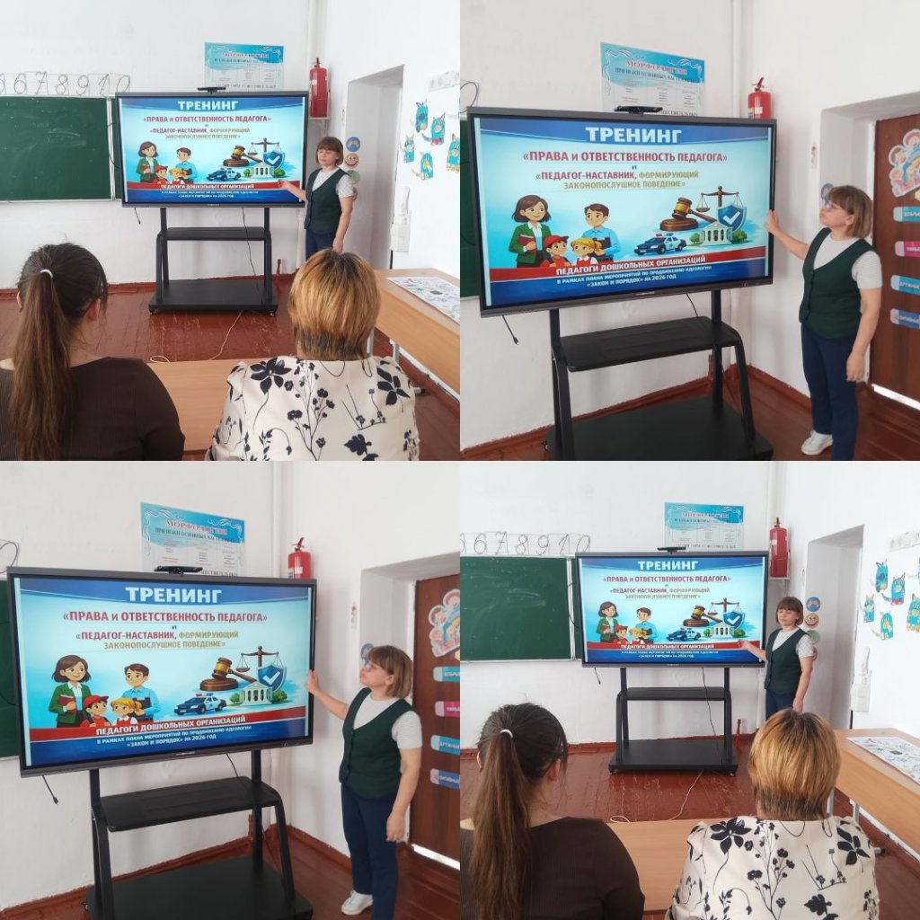12 наурызда Мектепке дейінгі ұйымдардың педагогтерімен "заң және тәртіп" идеологиясын ілгерілету жөніндегі іс-шаралар жоспары шеңберінде "педагогтың құқықтары мен жауапкершілігі" және "заңға бағынатын мінез-құлықты қалыптастыратын Педагог-тәлімгер"тақырыптарында тренинг өтті